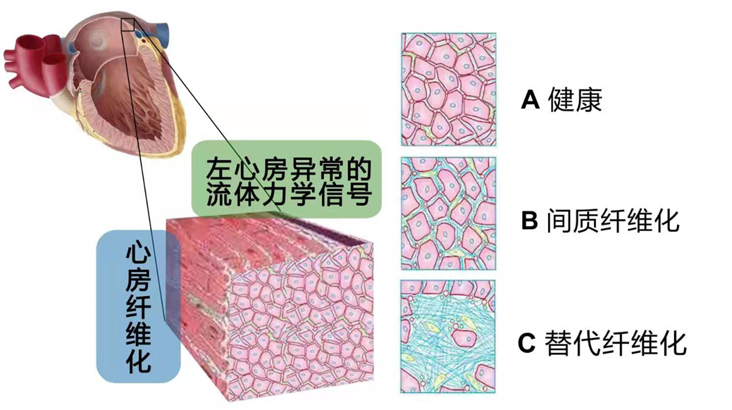 圖2 左心房異常的流體力學(xué)信號導(dǎo)致心房纖維化的發(fā)生,A健康狀態(tài),B間質(zhì)纖維化狀態(tài),C 替代纖維化狀態(tài)。