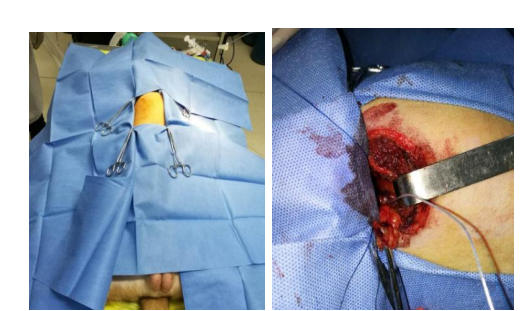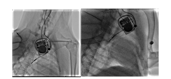 團(tuán)隊構(gòu)建犬的慢性房顫動物模型,分析無創(chuàng)體表心電標(biāo)測和有創(chuàng)心外膜心電標(biāo)測系統(tǒng)采集的心電信號的相關(guān)性。我們通過經(jīng)頸靜脈介入(圖10)和右外側(cè)開胸小切口(圖11)兩種方法建立快速起搏右心房的犬慢性房顫模型