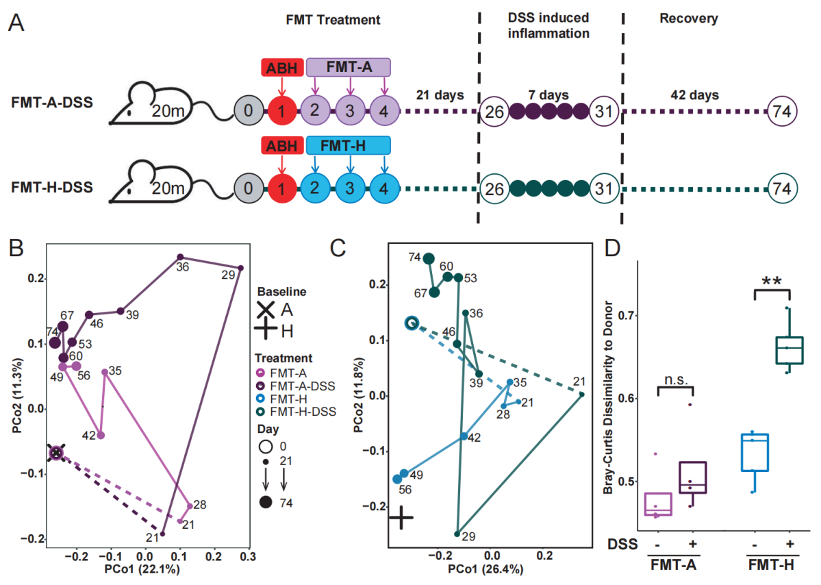 最后,研究人員對(duì)接受自體或異體FMT后的小鼠使用化學(xué)物質(zhì)(葡聚糖硫酸鈉,DSS)誘發(fā)結(jié)腸炎癥,引起對(duì)新建立的腸道菌群穩(wěn)態(tài)的再次擾動(dòng)(圖2A)。對(duì)于接受自體移植的老齡小鼠,腸道菌群的恢復(fù)過(guò)程僅被誘導(dǎo)的炎癥短暫地?cái)_動(dòng),第 53 天后的無(wú)論是誘發(fā)腸炎的受體鼠(FMT-A-DSS組)還是移植后沒(méi)有誘發(fā)腸炎的受體鼠(FMT-A組)其腸道菌群組成均相似(圖 2B),與老年供體的距離沒(méi)有顯著差異(圖 2D)。相反,異體移植所建立的腸道菌群則無(wú)法在擾動(dòng)后維持其組成,異體移植后接受腸炎誘導(dǎo)的小鼠(FMT-H-DSS)其菌群組成逐漸恢復(fù)到了移植前老齡小鼠原始的菌群穩(wěn)態(tài)(圖2C),與僅接受異體糞菌移植(FMT-H組)小鼠相比其菌群組成明顯偏離其供體(圖 2D)。