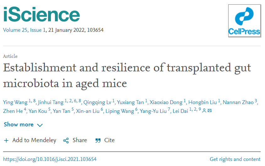 2022年1月21日,中國(guó)科學(xué)院深圳先進(jìn)技術(shù)研究院合成生物學(xué)研究所、深圳合成生物學(xué)創(chuàng)新研究院戴磊課題組在Cell子刊iScience雜志發(fā)表了題為“老齡小鼠移植腸道菌群的建立和恢復(fù)力(Establishment and resilience of transplanted gut microbiota in aged mice)”的文章。該項(xiàng)研究對(duì)老齡小鼠進(jìn)行了來(lái)自自體或異體宿主的糞便菌群移植,跟蹤觀察發(fā)現(xiàn)移植后腸道菌群成功定植并分別建立與宿主類似的穩(wěn)態(tài)菌群結(jié)構(gòu),并對(duì)宿主結(jié)腸轉(zhuǎn)錄組產(chǎn)生長(zhǎng)期影響。此外,對(duì)于移植后的小鼠進(jìn)行化學(xué)誘導(dǎo)腸道炎癥,發(fā)現(xiàn)異體移植建立的菌群經(jīng)過(guò)再次擾動(dòng)后,無(wú)法維持與供體相似的穩(wěn)態(tài),而是恢復(fù)為老齡宿主移植前的初始狀態(tài)。本研究說(shuō)明對(duì)于老齡宿主進(jìn)行異體腸道菌群移植后應(yīng)該長(zhǎng)期關(guān)注其穩(wěn)定性并在有需要時(shí)進(jìn)行重復(fù)移植。助理研究員王瑩博士、中國(guó)科學(xué)院大學(xué)碩士生湯錦輝為共同第一作者,戴磊研究員為通訊作者。共同作者包括中國(guó)科學(xué)院深圳先進(jìn)技術(shù)研究院腦認(rèn)知與腦疾病研究所的劉欣安副研究員、王立平研究員,哈佛大學(xué)醫(yī)學(xué)院的劉洋彧教授,深圳未知君生物科技的譚驗(yàn)博士等人。
