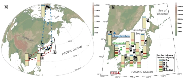 爆炸性火山噴發是東亞地區重要的自然災害,研究火山噴發歷史和火山灰分布是理解爆炸性噴發的頻率和識別不同火山危險程度的重要途徑。在東亞,日本火山的噴發歷史有較詳盡的研究,但通常基于可見火山灰記錄。此外,區內還有很多活火山,其噴發的可能性仍需進一步探明。顯微火山灰方法能有效地查明地質歷史中更為完整的噴發記錄,但該方法在東亞地區,特別是海洋沉積中僅有極少的應用,阻礙了人們認識區內火山完整的噴發歷史。