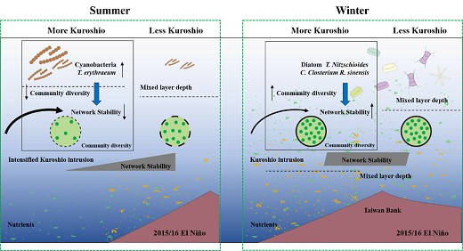 El Nino夏季黑潮入侵加強(qiáng)引發(fā)了更高的固氮藍(lán)藻-束毛藻Trichodesmium erythraum的豐度,顯著降低了浮游植物網(wǎng)絡(luò)穩(wěn)定性,揭示了2015/16El Nino事件期間黑潮入侵加強(qiáng),通過平流輸送攜帶束毛藻,以及影響溫度、混合層深度以及營養(yǎng)鹽濃度,進(jìn)而影響南海東北部浮游植物群落結(jié)構(gòu)的機(jī)制(圖2),研究成果為氣候變化對海洋生態(tài)系統(tǒng)的影響提供了科學(xué)證據(jù)。