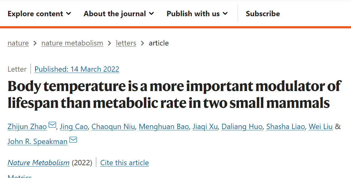 北京時間3月15日凌晨,中國科學院深圳理工大學(籌,以下簡稱“深理工”)藥學院講席教授、中國科學院深圳先進技術研究院醫藥所能量代謝研究中心首席科學家約翰·羅杰·斯彼克曼(John Roger Speakman)團隊聯合溫州大學趙志軍教授團隊、聊城大學、英國阿伯丁大學等單位的合作成果發表于《自然—代謝》(DOI:10.1038/s42255-022-00545-5)。該研究成果厘清了代謝率與體溫對壽命的影響,揭示了在特定條件下,體溫對壽命的影響更大。趙志軍為本文第一作者,趙志軍和John Speakman教授為共同通訊作者。溫州大學為第一署名單位,合作單位為聊城大學、中科院深圳先進技術研究院、Aberdeen University of UK、中科院遺傳與發育生物學研究所。本項工作得到了國家自然科學基金委面上基金等項目的資助。