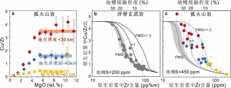 圖1. a)弧火山巖中Cu/Zr比與MgO協(xié)變圖,b,c)定量模擬地幔熔融過程中原生洋中脊玄武巖和原生弧巖漿Cu/Zr的系統(tǒng)變化,指示弧下地幔比洋中脊下方地幔更氧化。