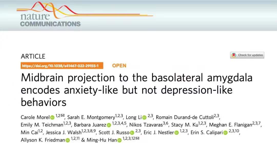北京時間2022年3月22日,中國科學院深圳理工大學(籌,暫定名,以下簡稱“深理工”)生命健康學院、中國科學院深圳先進技術研究院腦認知與腦疾病研究所韓明虎團隊在Nature 旗下Nature Communications (IF 14.9)上發表題為“Midbrain projection to the basolateral amygdala encodes anxiety-like but not depression-like behaviors”的最新研究成果。揭示了投射至基底外側杏仁核(BLA)的腹側被蓋區(VTA)多巴胺(DA)神經元編碼焦慮樣行為而不是抑郁樣行為。此外,VTA-BLA多巴胺神經元無論是在焦慮單獨條件下,還是在焦慮/抑郁共病條件下,都選擇性地控制焦慮相關行為。