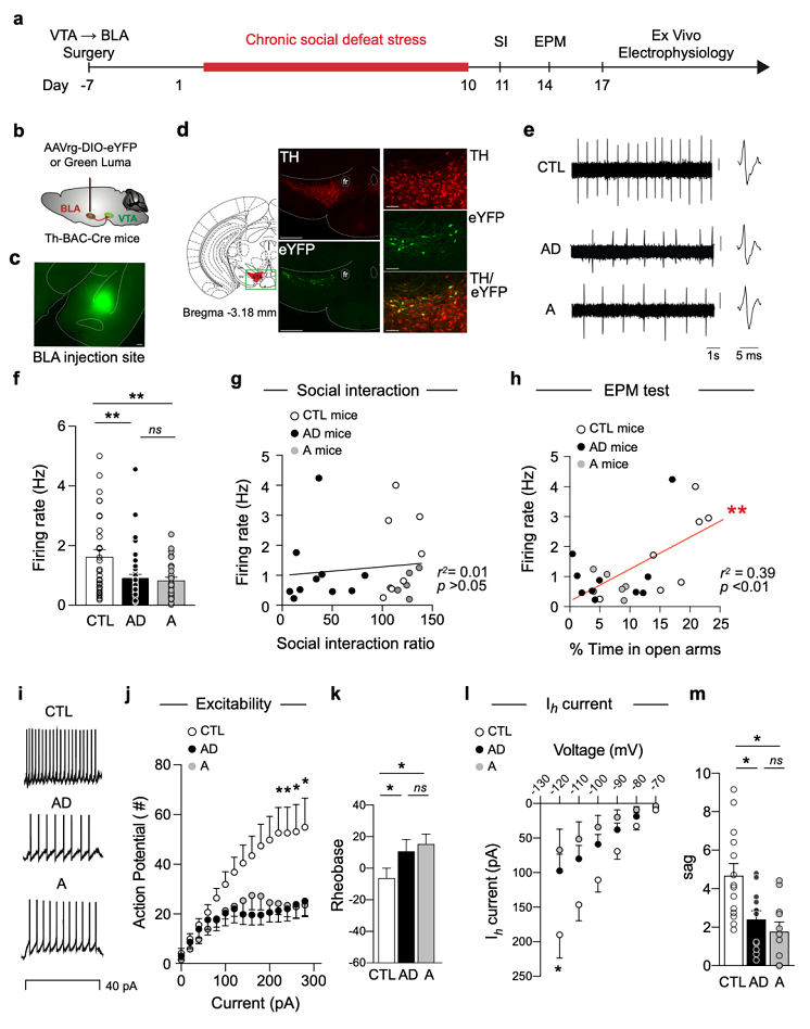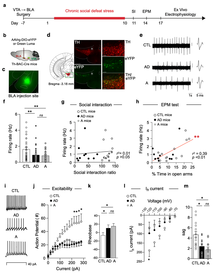 為了尋找焦慮樣行為的神經機制,團隊聚焦在焦慮相關的腦核團AMG,逆行標記了VTA-BLA DA神經元并檢測了它們的基礎放電頻率,發現與對照組相比,AD和A小鼠的基礎發放頻率均顯著降低(圖3)。與對照組比較,AD和A組的VTA-BLA DA神經元的興奮性也降低,并伴有興奮性的超極化激活陽離子電流Ih顯著變小。進一步相關性分析揭示VTA-BLA DA神經元活動與社交互動行為無關,但與EPM開臂時間呈顯著相關。這些生理學和行為學數據支持了VTA-BLA DA神經元可能選擇性地介導CSDS誘導的焦慮樣行為的猜想。