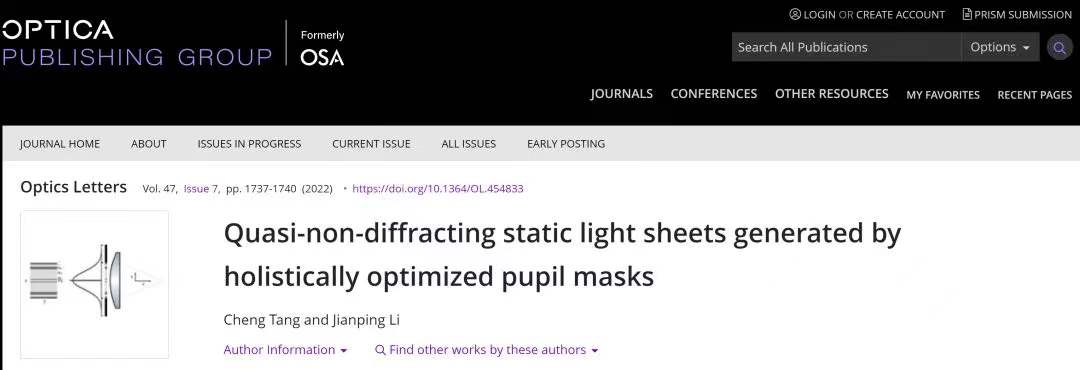 3月26日,中國科學院深圳先進技術研究院光電工程技術中心李劍平正高級工程師團隊在知名光學期刊Optics Letters上發表了題為“Quasi-non-diffracting static light sheets generated by holistically optimized pupil masks”的文章,報道了一種生成薄而寬的準無衍射激光光片的光瞳掩模優化設計方法。博士后研究員唐城博士為論文第一作者,李劍平博士為通訊作者。