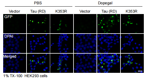 圖1:DOPAGEL促進細胞內Tau的聚集而K353R突變可以阻斷DOPEGAL的促進作用