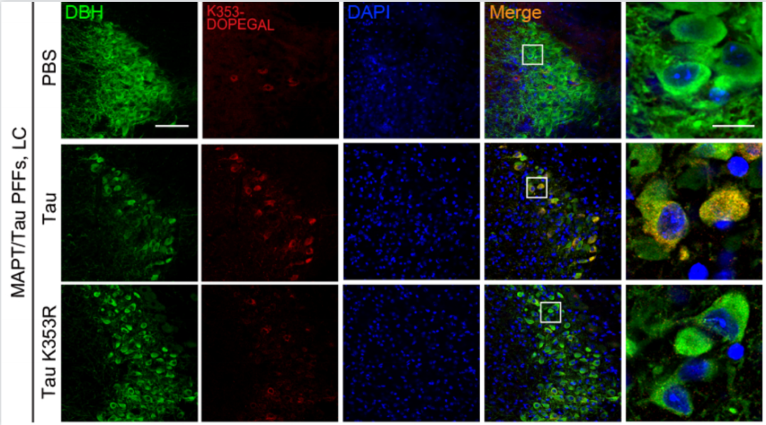 圖2:阻斷DOPEGAL對Tau的修飾可以延緩Tau的聚集,向過表達Tau的轉基因小鼠腦內注射Tau聚集體可以誘導腦內的Tau聚集,而突變K3533位點后阻斷了DOPEGAL對Tau的修飾,腦內Tau的聚集減少