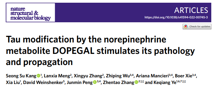北京時間2022年3月25日,Nature Structural & Molecular Biology 雜志在線發表了深圳理工大學(籌,暫定名,以下簡稱“深理工”)葉克強團隊和武漢大學人民醫院張振濤團隊的最新成果。研究團隊發現腦內藍斑部位的去甲腎上腺素代謝產物DOPEGAL共價修飾Tau蛋白的K353位點,促進Tau的聚集和病變的播散。本研究為探索阿爾茨海默病(Alzheimer’s disease, AD)的發病機制提供了新的視角。