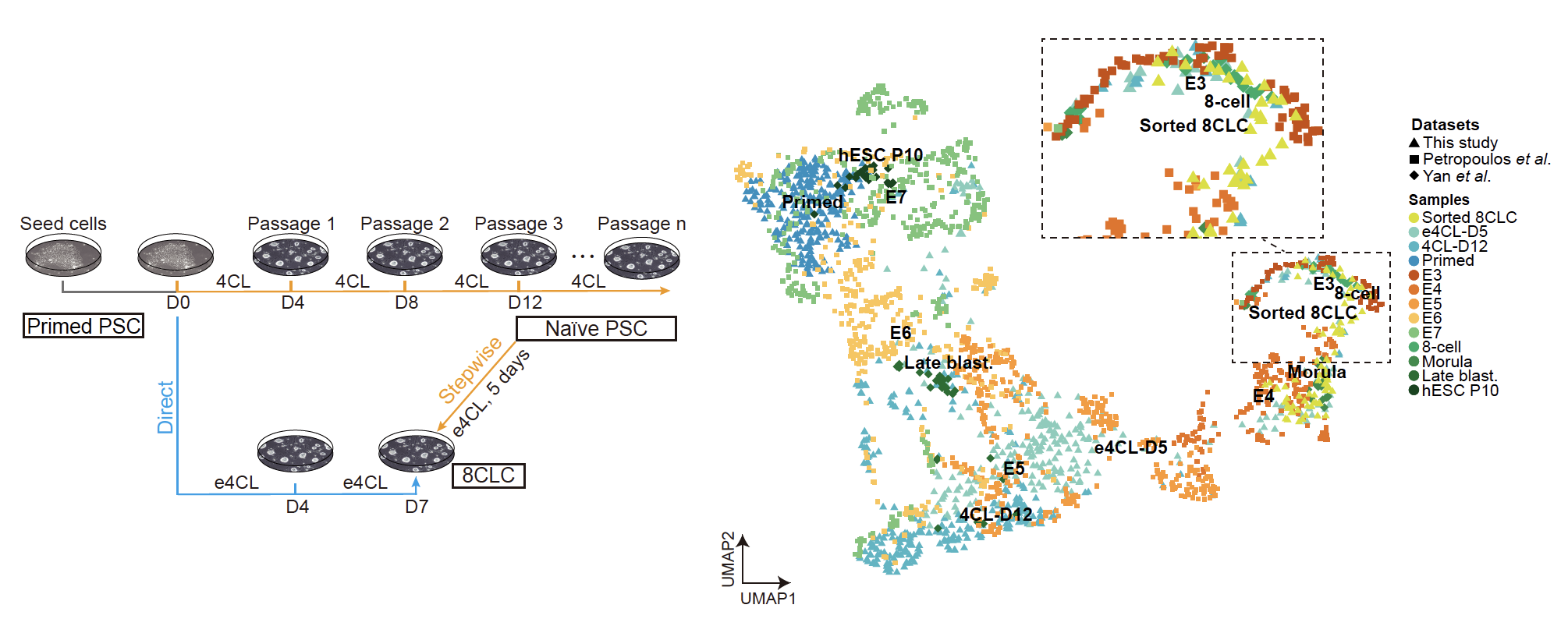 3月22日,中國科學院廣州生物醫(yī)藥與健康研究院Miguel A. Esteban研究組開發(fā)了一種非轉(zhuǎn)基因、快速且可控的重編程方法,將人多能干細胞(PSC)誘導為全能性的8細胞期胚胎樣細胞(8CLC),相關進展以Rolling back of human pluripotent stem cells to an 8-cell embryo-like stage”題發(fā)表在Nature雜志上。研究人員運用單細胞測序技術,分析確定了8CLC與人8細胞期胚胎的高度相似性,描繪了轉(zhuǎn)化過程的關鍵分子事件和基因調(diào)控網(wǎng)絡,并進一步評估了8CLC的分化能力。