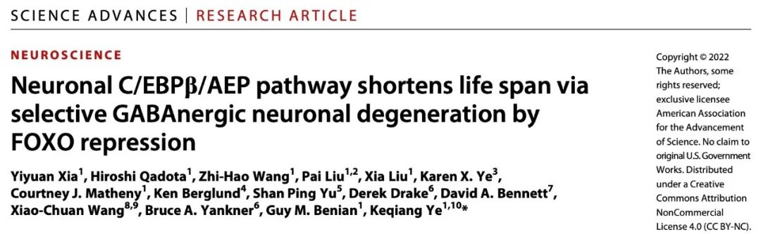 北京時間3月31日,中國科學院深圳理工大學(籌,暫定名,簡稱“深理工”)講席教授(前美國埃默里大學終身教授)葉克強博士團隊在《科學進展》(Science Advances) 雜志上發表題為Neuronal C/EBPβ/AEP pathway shortens life span via selective GABAnergic neuronal degeneration by FOXO repression的文章,團隊在以往的研究理論基礎上,提出阿爾茲海默癥與人的預期壽命均受大腦中的“C/EBPβ/AEP”神經信號通路影響。C/EBPβ是眾所周知的調節營養代謝、能量穩態和脂肪分化的轉錄因子。它可能在決定壽命長短中發揮作用。值得注意的是,C/EBPβ介導了多種與年齡相關的基因,并且其表達水平在老化的神經細胞中急劇升高。文章第一作者為夏亦元博士,葉克強博士后;通訊作者為葉克強教授。