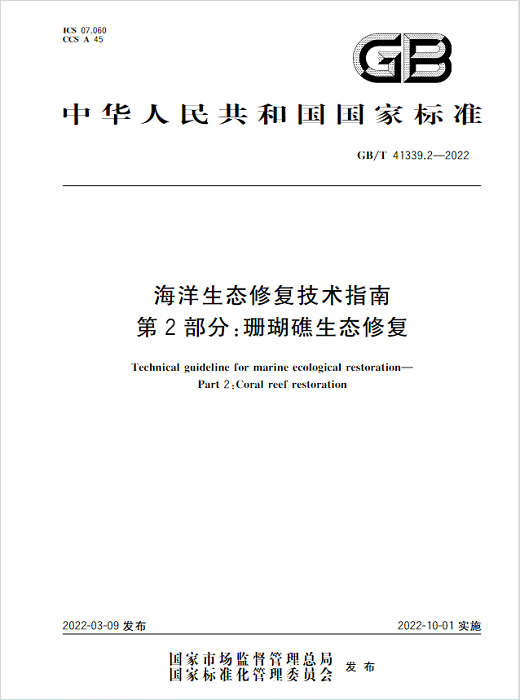 標準“海洋生態修復技術指南 第2部分:珊瑚礁生態修復”規定了珊瑚礁生態系統修復的工作流程、工作內容、方法及技術等技術要求。提出了從資料收集與實地踏勘過程中應關注的珊瑚礁生態相關指標、珊瑚礁生態修復選址宜遵循的各項條件到修復方案設計中的內容,以及實施過程中的注意事項,并明確了在修復實施后的管理與維護要求。
