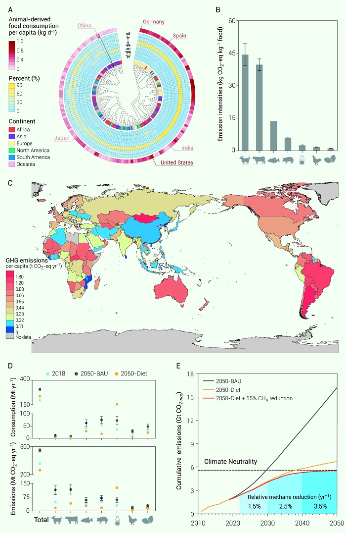圖A,2018年全球168個國家動物源食品消費量及組成; B,動物源食品的碳排放強度;C,2018年各個國家人均動物源食品消費相關的溫室氣體排放量;D,動物源食品消費及其相關的溫室氣體排放,其中2050-BAU代表基準情景,2050-Diet代表膳食標準;E,不同情景下中國畜牧業累積的二氧化碳增溫潛勢,其中虛線代表達到氣候中性。
