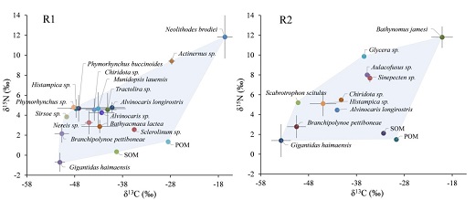 冷泉是指從海底沉積物中滲漏出的富含甲烷、硫化氫或其他碳氫化合物的流體,流體噴口附近可發育出化能自養的大型底棲生物群落。目前在南海共發現了四十多個存在冷泉滲漏活動的區域。海馬冷泉發現于2015年,位于海南島東南部1300-1400m深處的海床。本研究利用深潛器獲取了海馬冷泉區大量底棲生物樣品,并利用碳氮穩定同位素(δ13C 和 δ15N)分析了冷泉生物間的營養關系。結果表明,海馬冷泉區大型底棲生物的食物主要來源于化能自養,但貽貝床中的大部分大型底棲生物的δ13C值與海馬貽貝相差甚遠,表明這些生物并非直接以貽貝為食物來源。甲烷氣體滲漏強度弱的區域大型底棲生物的營養生態位分化程度要高于冷泉滲漏強度大的區域(圖1)。海馬冷泉大型底棲生態系統中捕食與被捕食的營養關系不顯著,其中新巖蟹(Neolithodes brodiei)和具足蟲(Bathynomus jamesi)這兩個疑似頂級捕食者,其食物可能主要來源自上層的光合生態系統。