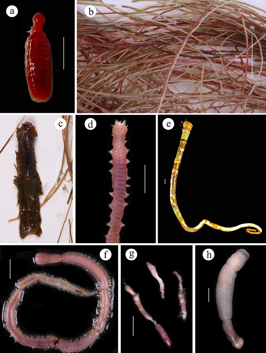 圖4 海馬冷泉區的環節動物. a 佩氏鰓鱗蟲Branchipolynoe pettiboneae; b 硬須蟲Sclerolinum sp.; c 神女蟲Sirsoe sp.; d 沙蠶Nereis sp.; e 管蟲Paraescarpia echinospica; f 吻沙蠶Glycera sp.; g 小頭蟲Capitella sp.; h 星蟲Sipuncula sp. 比例尺= 1 cm.