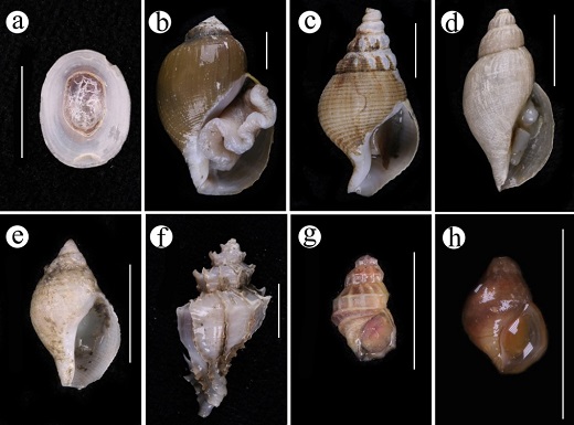 圖5 海馬冷泉區的腹足類. a 乳白深海笠貝Bathyacmaea lactea; b 擬娥螺Phymorhynchus buccinoides; c 峨螺Aulacofusus sp.; d 渦螺Tractolira sp.; e 擬娥螺未定種Phymorhynchus sp.; f 骨螺Scabrotrophon scitulus; g 飾肋普氏螺Provanna fenestrata; h 光滑普氏螺Provanna glabra. 刻度尺 = 1 cm.