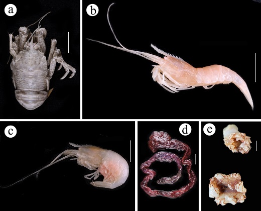 圖6 海馬冷泉區的大型底棲生物. a 勞盆擬刺鎧蝦Munidopsis lauensis; b 長角阿爾文蝦Alvinocaris longirostris; c 阿爾文蝦Alvinocaris sp.; d 指參Chiridota sp.; e 海葵Actinernus sp. 刻度尺 = 1 cm.