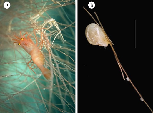 海馬冷泉區底棲生物群落主要存在四種類型:分別為貽貝床、蛤床、細管蟲叢和大管蟲叢群落(圖2)。本研究共采集鑒定了30余種大型底棲生物(圖3-6),大部分種類采集于活躍冷泉噴口附近的貽貝床,而伴溢蛤床中分布的底棲生物種類極少。細管蟲叢是在海馬冷泉中一個獨特的生物群落,發現于冷泉強滲漏區附近,主要由一種極纖細的管蟲(Sclerolinum sp.)組成,細管蟲幾丁質管的長度常超過1m。這種細管蟲的莖上黏附有大量的貽貝幼體,推測這種細管蟲群落可能是海馬貽貝幼體的重要發育場所(圖7)。