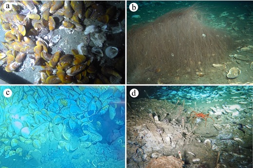 圖2 海馬冷泉區四種典型的生物群落. a 貽貝床mussels bed,b 細管蟲叢cluster of slim tubeworm among dead clams,c 蛤床clams bed,d 大管蟲叢large tubeworm at authigenic carbonate mound