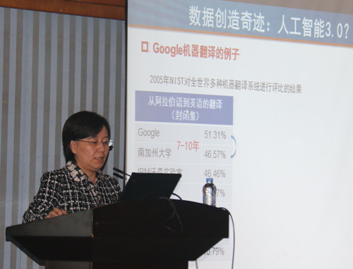 王穎在報告中,從“機器智能與人工智能、大數據與思維革命、未來社會的人工智能”三個方面闡釋了大數據與人工智能的歷史、現狀以及發展前景等,并結合實例對大數據與人工智能的產生、特征及運用等方面進行分析、論證,表達了對未來大數據與人工智能應用的美好期望。
