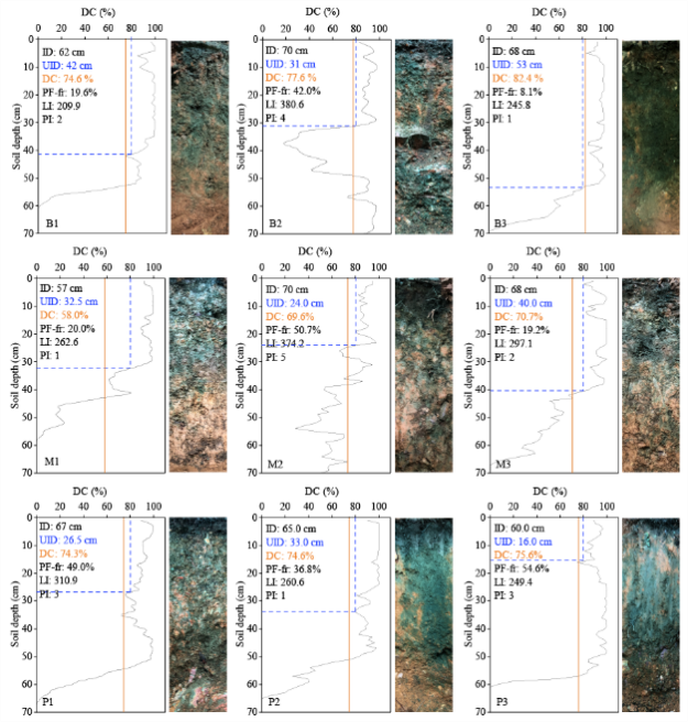 土壤水分運移行為通常有兩種表現形式,即優先流和基質流。水分運移的活躍程度會直接影響溶質遷移、地下水交換及植物水分獲取等過程。該研究依托鼎湖山站,分析了亞熱帶森林演替序列上的三種不同林型內(常綠闊葉林BF,混交林MF和馬尾松林PF)的土壤水分運移格局及驅動機制,結果表明:盡管前兩個林型內的土壤連通性(如容重和孔隙度)以及水分入滲能力均優于馬尾松林,但是土壤水分運移格局和優先流程度并未呈現相同的變化趨勢,主要的原因可歸于復雜的土壤孔隙分布。土壤中的大孔隙是優先流的通道,植物根系、裂縫、石礫、洞穴等因素都是形成大孔隙的條件,它們的分布格局影響水分流動路徑以及優先流程度。從染色剖面來看,在三個林型的9個采樣點中,土壤中的石礫、根系、裂縫等分布不均勻,這些對水分運移路徑產生深刻影響,例如優先流程度(PF-fr, LI, PI)呈現不同程度的變化(圖1)。該研究為開展森林水土資源管理提供了水文前情認知。