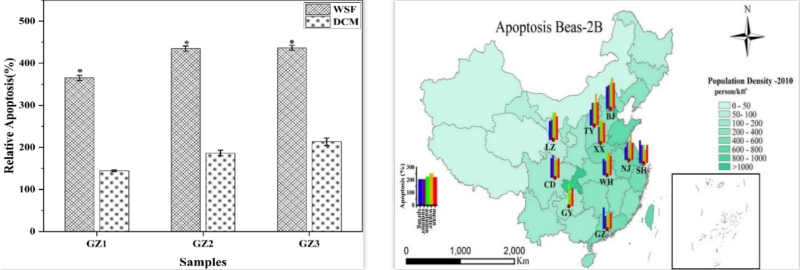 本次研究收集了中國十個大型城市,一年四季的PM2.5樣品,根據其誘導的大氣顆粒物模式細胞--人體肺上皮細胞Beas-2B 的細胞毒性(細胞凋亡數據),分析評估了同等體積空氣中,PM2.5水溶性組分和有機組分誘導的細胞毒性能力的大小,然后針對毒性較大的組分中起關鍵作用的化合物,進行結構和來源解析。主要結論如下: