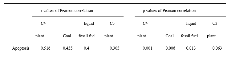 表1:不同污染來源的化合物相對含量與細胞凋亡之間的相關性分析。