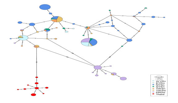 最小間距網狀圖(minimum spanning network)顯示生活在中國水域的江豚大多存在共享單倍型。但來自泰國灣的江豚卻形成了獨特的單系群,其與南海其它寬脊江豚種群之間的遺傳分化水平也高于迄今已知的大多數江豚種群間的分化水平。