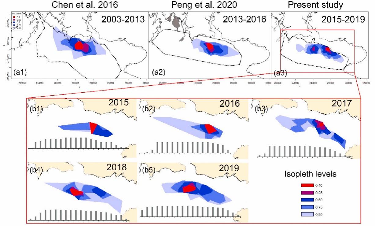 2022年12月20日,中科院深海所海洋哺乳動物研究團隊與汕頭大學(xué)研究團隊合作,在國際學(xué)術(shù)期刊Journal of Environmental Management發(fā)表題為《Ranging pattern development of a declining delphinid population: A potential cascade effect of vessel activities》的研究文章。該研究提取了北京大學(xué)、北部灣大學(xué)、廣西省科學(xué)院等團隊在北部灣大風江口水域(下稱該水域)的已發(fā)表目擊數(shù)據(jù),并整合了深海所與汕頭大學(xué)2015年至2019年間系統(tǒng)調(diào)查結(jié)果,分析該海域中華白海豚空間分布的長期變化。研究結(jié)果顯示,該水域中華白海豚的活動范圍在本世紀初顯著減少。盡管海豚的整體活動范圍在近十年內(nèi)較為穩(wěn)定地集中在三娘灣至廉江灣一帶海域,但海豚的核心棲息地存在明顯的偏移。與早期空間分布模式相比,該海域的海豚核心棲息地在2015-2017年間從三娘灣沿岸東移至廉江灣外圍海域,而又在2018-2019年稍回落至三娘灣一側(cè)。