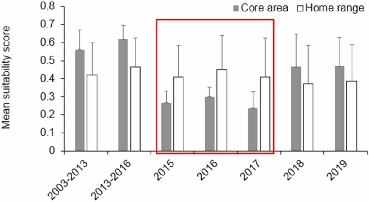 該研究進一步建立了該水域中華白海豚環(huán)境適合度模型,發(fā)現(xiàn)該種群在2015-2017年的核心活動范圍并非白海豚的最適宜棲息地。此期間海豚核心活動范圍的棲息地平均適合度甚至要低于整體家域的平均適合度。與之對應(yīng)的是,研究團隊不久前發(fā)現(xiàn)該水域中華白海豚的存活率在棲息地東移期間處于極低水平。基于這些發(fā)現(xiàn),研究人員提出該水域中華白海豚種群波動的新假說:船舶活動的快速增長改變了中華白海豚的空間利用策略,進入船舶活動強度低但適合度較低的水域活動;而在低適合度的環(huán)境生活的風險造成適應(yīng)度大幅降低,并經(jīng)歷了快速的種群衰退。最終海豚權(quán)衡船舶和棲息地適合度的影響,重新調(diào)整空間使用策略而回到船舶活動強度高但適合度更高的水域生活。
