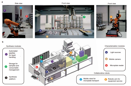 其中自動化平臺由自動化合成模塊、自動化表征模塊和協作機器人三大模塊構成,每個模塊包含若干子模塊,具有高通量合成、樣品存儲、原位光學、光譜學表征等功能(圖1)。