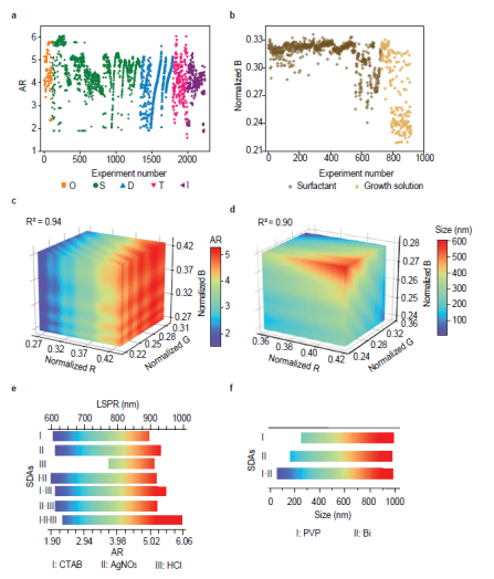 為了實現自動化合成,研究人員對文獻進行了數據挖掘,以提供關鍵合成參數的初始選擇。針對金納米棒,對1300篇已報道的金納米棒合成的相關文獻進行數據挖掘,并對其關鍵參數進行分水平排序,從而獲取機器人執行參數,并設計正交實驗及高通量實驗驗證,獲取了金納米棒形貌調控的重要參數。針對雙鈣鈦礦,通過對其他鈣鈦礦相關文獻進行數據挖掘,篩選出潛在的可供調節雙鈣鈦礦尺寸形貌的48種溶劑和61種表面活性劑,結合高通量原位合成和表征,快速實現了溶劑和表面活性劑的篩選。