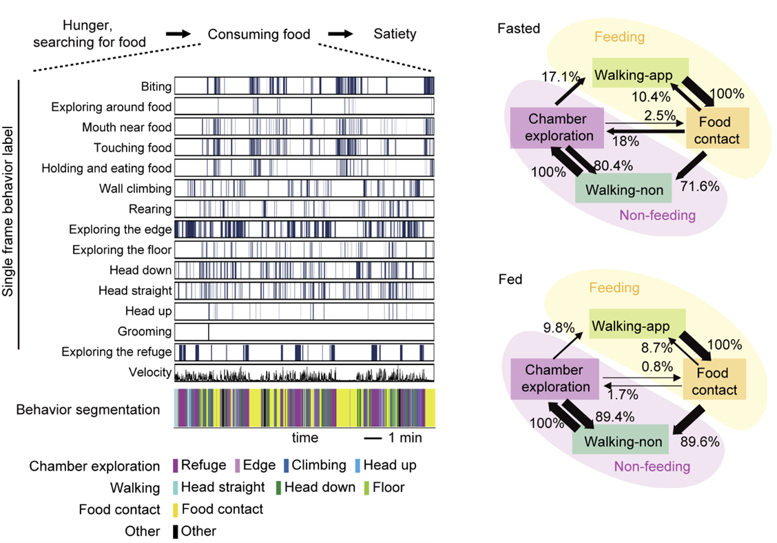 王立平團隊利用深度學習算法輔助的行為跟蹤與記錄系統,對小鼠攝入食物這一階段中的自發行為進行了細致研究。通過深度學習算法識別單幀錄像中小鼠的動作,總共識別出14種特征動作,并通過聚類算法將這些動作劃分為8種有意義的行為,進而將這些行為分為攝食、行走和探索環境等三類,并將小鼠在攝入食物這一階段的自發行為描述為“靠近食物、攝食、離開食物、探索環境”等一系列行為的循環。