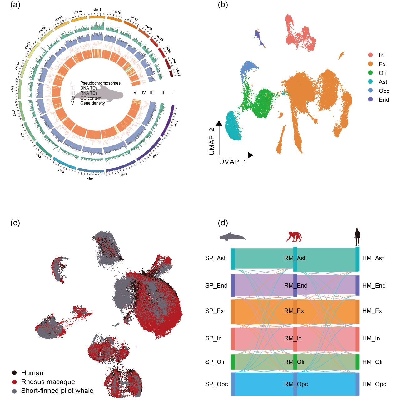 圖1(a) 短肢領航鯨染色體圈圖;(b) 腦皮層細胞類型的UMAP圖;(c) 短肢領航鯨、人類和獼猴皮層細胞的UMAP圖;(d) 顯示短肢領航鯨(左)、獼猴(中)、人(右)皮層細胞類型之間連通性的桑基圖