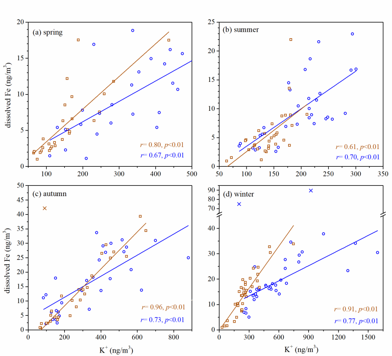圖1. 各個季節粗細粒子中可溶性Fe與鉀離子的相關性。