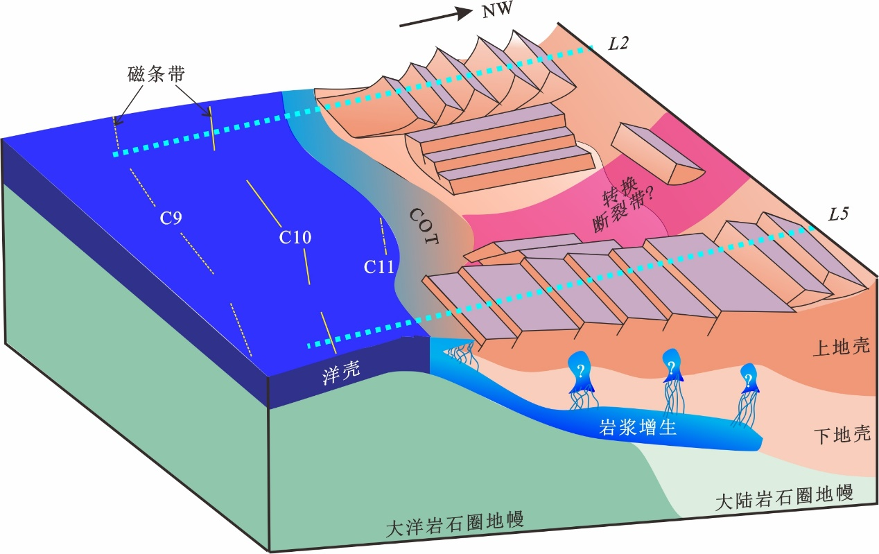 基于三維OBS深地震探測實驗結果(圖1&2),結合重力、磁力、多道地震和IODP鉆井資料,研究人員精準確定了南海北部陸緣IODP鉆探區的陸洋過渡帶(COT)范圍,闡明了北部陸緣地殼結構在橫向上的劇烈變化,劃分出兩個不同的陸緣段,東段(包含L5主測線)顯示受到構造和巖漿的共同作用,西段(包含L2主測線)則以構造伸展為主,研究認為先存的巖石圈局部非均質性造成了陸緣分段破裂及其不同的張破裂樣式。