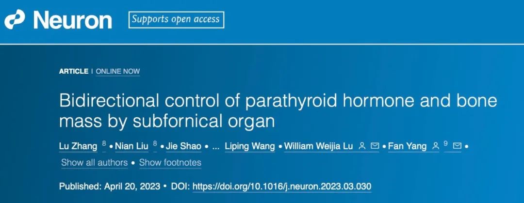 4月20日,中國科學院深圳先進技術研究院腦認知及腦疾病研究所楊帆團隊在神經科學著名刊物Neuron雜志在線發表了題為“Bidirectional Control of Parathyroid Hormone and Bone Mass by Subfornical Organ (大腦穹窿下器官雙向調節甲狀旁腺素分泌及骨量)”的研究論文,詳細描述了小鼠的中樞神經系統穹窿下器官(subfornical organ, SFO)感受外周甲狀旁腺激素(parathyroid hormone, PTH),并通過下丘腦室旁核(paraventricular nucleus, PVN)以及交感神經反饋調節外周PTH變化進而干預骨代謝的機制。深圳先進院楊帆研究員,深圳理工大學(籌)呂維加教授為共同通訊作者,張路博士與劉念博士為論文的共同第一作者。