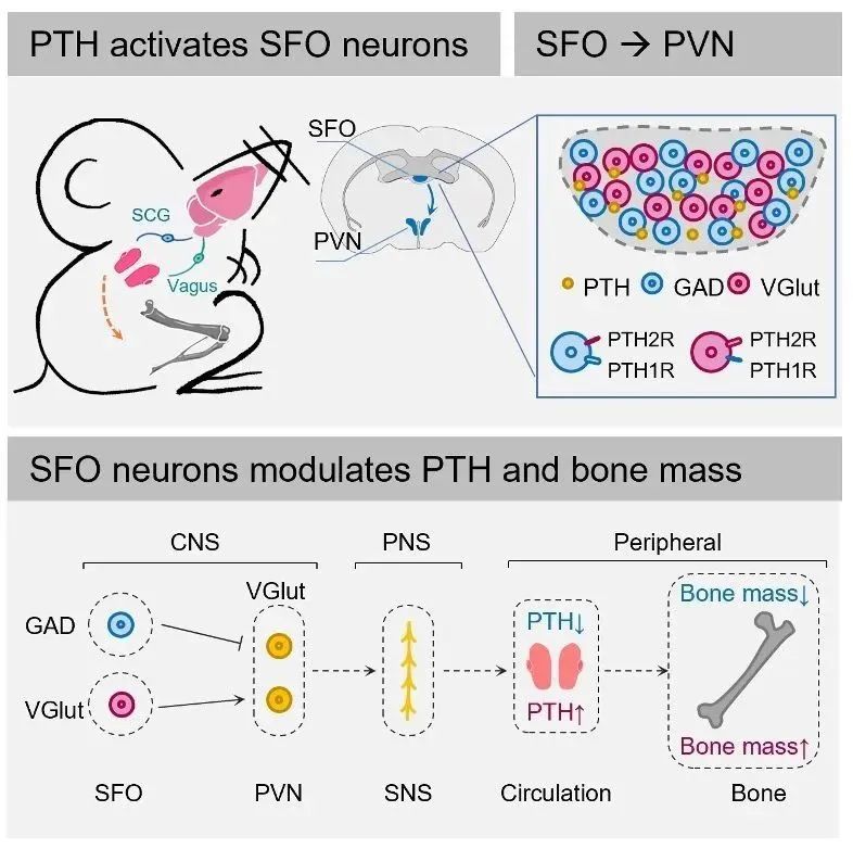 綜上所述,這一研究揭示了中樞SFO腦區感知外周PTH,分別通過GABA能及Glut能神經元以及交感神經對PTH水平進行調節,并進一步調節骨代謝的神經機制。該機制的發現首次揭示了大腦-甲狀旁腺-骨軸在維持骨代謝穩態中的關鍵作用,進一步完善了大腦-內分泌-骨骼系統互作調控的學術理論體系,也拓展了精準調控中樞神經干預內分泌激素水平的新技術和方法手段,為我們深入理解機體維持骨穩態的機理提供了新的研究思路。