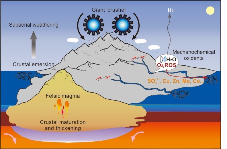 研究團隊提出,超級山脈的物理風化可構成中太古代的“產氧工廠”(圖3)。當時大陸上的礦物機械化學產氧通量達到1.73×108~1.17×109 mol yr-1,并隨著大陸地殼的生長和長英質化而漸進增加,這足以引發太古代局部氧化風化事件。值得注意的是,礦物機械化學氧化劑產量的時空變化本質上是地表環境對地球深部過程的響應,活性氧的氧化作用驅使大量營養元素遷移至太古代海洋,促進早期海洋生產力的興盛,這種過程驅動了巖石圈–生物圈的協同演化。