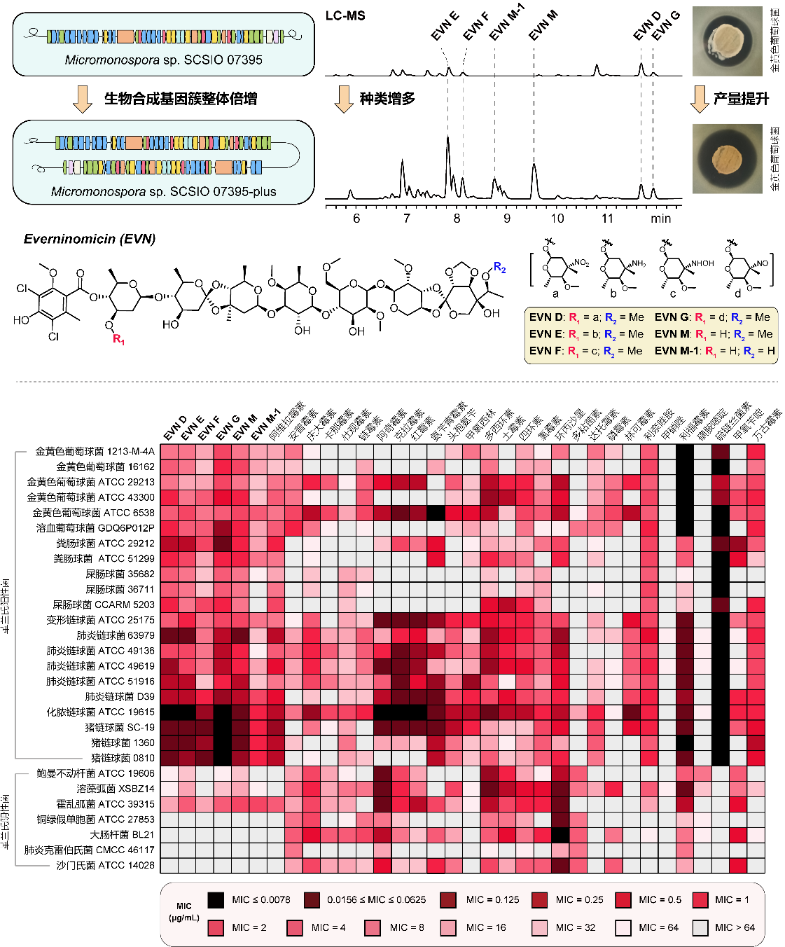 圖1 利用基因簇倍增的方法獲得增加多種everninomicin類天然產物及其與商用抗生素的活性比較