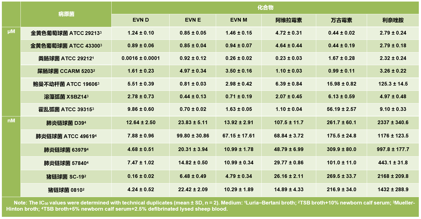 然后進一步選擇了抑菌譜相似的vancomycin、linezolid及avilamycin同化學性質穩定的everninomicin D、E和M進行了半抑制濃度(IC50)的比較。測試結果顯示everninomicin D、E和M對葡萄球菌和腸球菌的IC50與vancomycin、linezolid及avilamycin相當;對于鏈球菌則顯示出明顯的優勢,特別是everninomicin D和M在體外對肺炎鏈球菌及豬鏈球菌顯示出納摩爾級水平的抑制作用;此外,everninomicin E對三種革蘭氏陰性病原體鮑曼菌、溶藻弧菌和霍亂弧菌活性較為顯著(表1)。最后,進一步利用基因簇倍增技術構建了everninomicin M的高產菌株,目前最高產量可達98.6 mg/L,為后續動物實驗提供了物質基礎。