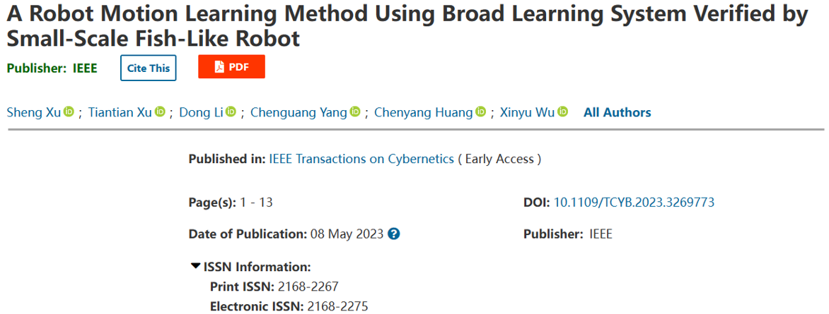 研究成果以“A Robot Motion Learning Method Using Broad Learning System Verified by Small-scale Fish-like Robot”為題,發表在智能控制領域權威期刊IEEE Transactions on Cybernetics(JCR一區,影響因子:19.118)。徐升副研究員為第一作者,徐天添研究員為通訊作者,中國科學院深圳先進技術研究院為第一單位。