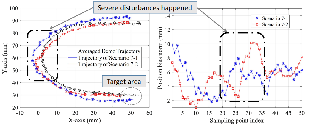 通過仿真及實驗,研究團隊運用所提的學習控制方法獲得了銳角彎、J形彎、S形彎等多種運動基元的微型機器人控制器,并開展了仿魚機器人避障運動實驗。在機器人運動過程中我們通過人為搖晃容器、暴力碰觸機器人模擬了真實場景中可能存在的復雜擾動,機器人在復雜環境中,直接調用C形彎,S形彎等運動基元實現高效避障,通過使用所提方法機器人均可以抵達最終指定區域,驗證了所提方法的強抗擾能力。該成果符合高層運動指令規劃的思想,大幅簡化了實時控制指令解算復雜度,為微型機器人的多機集群運動或無參考軌跡最優運動規劃打下基礎,同時還可推廣至無人機、無人車以及工業機器人的復雜運動控制。