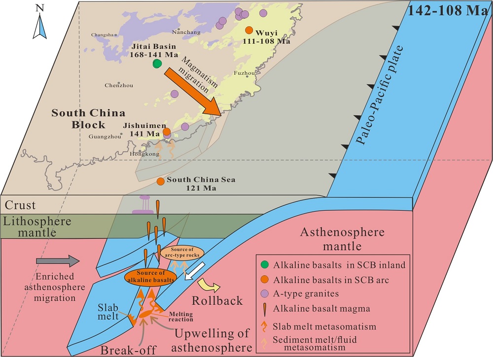 研究人員提出,地幔源區中的石榴石輝石巖可能是在古太平洋板塊斷裂的背景下,上涌的軟流圈地幔與俯沖板片邊緣相互反應形成,這種相互作用促使陸弧地幔組分多樣化。結合已有的堿性玄武巖資料,研究人員認為華南陸塊之下富集的軟流圈地幔自晚中生代以來由內陸向沿海依次形成,這可能與俯沖板塊斷裂控制下的軟流圈深部側向和垂向流動有關。