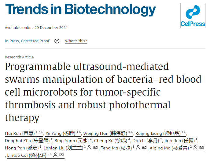 北京時(shí)間12月21日,中國(guó)科學(xué)院深圳先進(jìn)技術(shù)研究院醫(yī)藥所蔡林濤團(tuán)隊(duì)和醫(yī)工所馬騰團(tuán)隊(duì)聯(lián)合在國(guó)際學(xué)術(shù)期刊《Trends in Biotechnology》上發(fā)表了題為“Programmable Ultrasound-Mediated Swarms Manipulation of Bacteria-Red Blood Cell Microrobots for Tumor-Specific Thrombosis and Robust Photothermal Therapy”的文章。該工作成功開發(fā)了一種具有自主缺氧感知和超聲響應(yīng)功能的細(xì)菌-細(xì)胞生物機(jī)器人,通過缺氧靶向聯(lián)合超聲操控,實(shí)現(xiàn)腫瘤深層滲透和生成腫瘤特異性血栓,最終實(shí)現(xiàn)高效精準(zhǔn)治療。