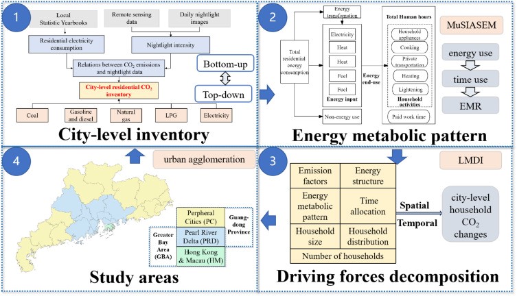 研究詳細(xì)展現(xiàn)了粵港澳大灣區(qū)(GBA)及周邊城市(PC)的城市級(jí)居民碳排放量分析過(guò)程,研究過(guò)程涵蓋了指導(dǎo)設(shè)計(jì)、數(shù)據(jù)收集、分析和解釋等環(huán)節(jié),采用城市級(jí)核算和時(shí)空分析方法。城市級(jí)核算利用消費(fèi)數(shù)據(jù)、夜燈數(shù)據(jù)和排放系數(shù)計(jì)算每個(gè)城市的能源代謝和二氧化碳排放量,隨后通過(guò)時(shí)空分析運(yùn)用LMDI模型,探究居民碳排放隨時(shí)間和空間變化的驅(qū)動(dòng)力和變化趨勢(shì)。