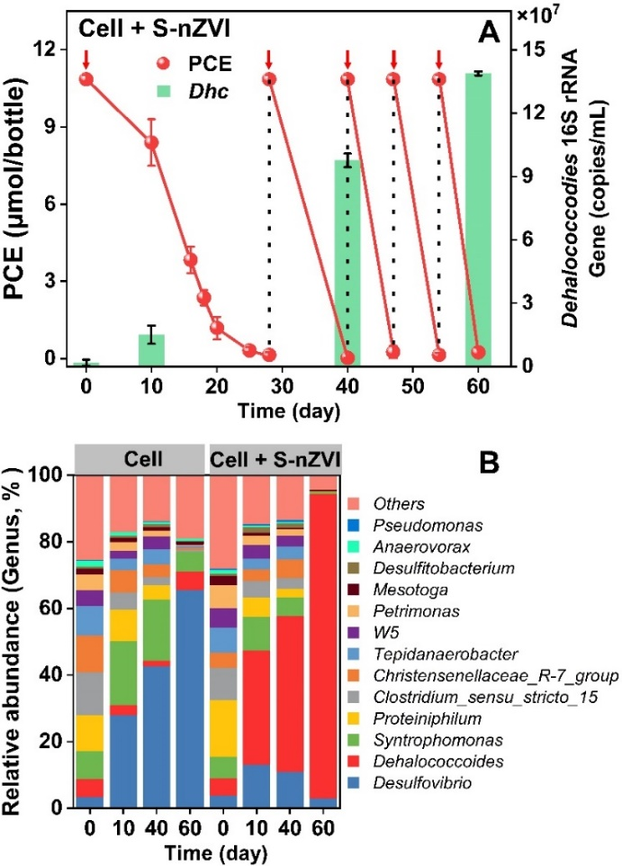 ????氯代烯烴作為一種廣泛分布于地下環境中的鹵代有機污染物,對生態環境和人類健康構成了嚴峻的威脅。面對這一挑戰,開發可持續的原位脫氯修復技術已成為治理氯代烯烴污染地下水的關鍵任務。微生物修復技術以其環保、高效、經濟的特點脫穎而出,通過引入大量有機電子供體(例如乳酸、乳化植物油等),促進脫鹵微生物,特別是氯呼吸菌(OHRB)的生長,實現對氯代烯烴的徹底脫鹵和無害化處理。然而,有機電子供體易被沖刷出處理區域,其發酵產物可能引起地下水質惡化和生物量過度增長導致的含水層堵塞。納米零價鐵(nZVI)作為一種廣泛應用于污染地下水和土壤原位修復的材料,其表面易被氧化或鈍化,這不僅降低了電子利用效率,也增加了應用成本。最新研究表明,通過表面硫化處理的納米零價鐵(S-nZVI)能夠提升材料的穩定性和反應活性。S-nZVI能夠降低氧化還原電位并提供電子,以支持微生物還原脫氯過程。將S-nZVI與OHRB結合使用,可能成為一項極具潛力的氯代乙烯污染地下水和土壤修復技術。盡管如此,S-nZVI與OHRB之間的相互作用機制以及它們對氯代乙烯還原脫氯的具體影響,目前尚不完全明確。