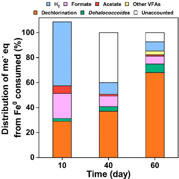 為了深入理解組合系統的電子流向和電子利用效率,我們采用電子流平衡分析法對系統中電子的分配進行了研究。分析結果表明,S-nZVI產生的電子當量主要用于PCE的脫氯反應和Dhc的生長,分別占據了68.1%和6.8%的電子當量(見圖4),這一比例顯著高于使用有機電子供體時脫氯過程所占的電子當量百分比(12–22%)。這一發現表明,該組合系統具有更高的電子利用效率,能夠更有效地引導系統中的電子流向脫氯過程,而非其他途徑。