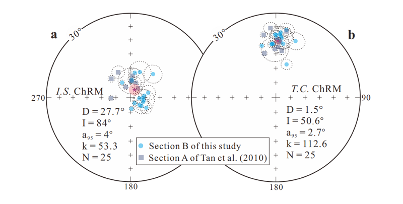 圖1?本研究報(bào)道的帕那組火山巖特征剩磁方向